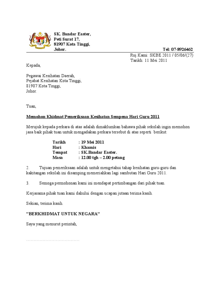 contoh surat mohon sokongan pejabat kesihatan