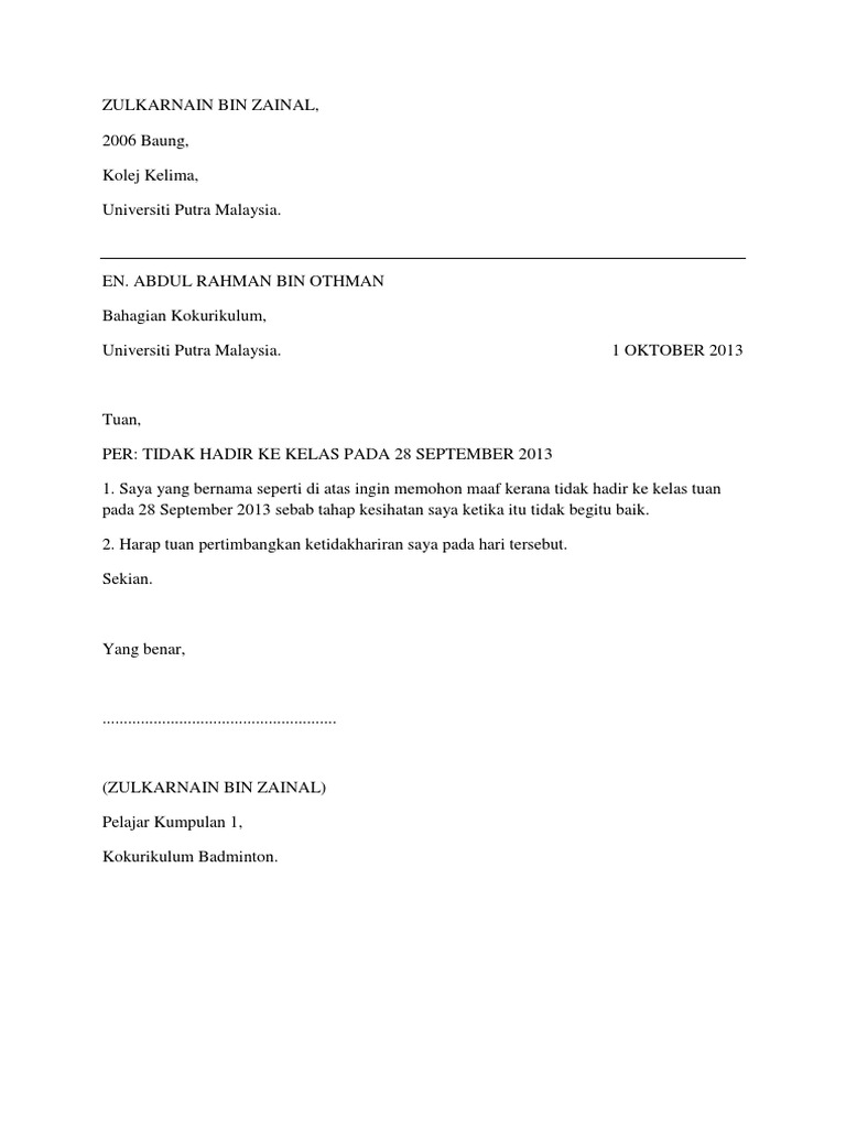 Surat Rasmi Tunjuk Sebab Tidak Hadir Kuliah Letter 7saudara Com